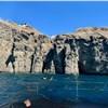 Embark on an unforgettable Caldera Sunset Cruise starting at 3:30 PM. We'll sail past the stunning Red and White Beach before our first swim stop at the secluded coves of Black Mountain. Next, we'll glide under the historic Venetian Lighthouse of Akrotiri and into the heart of the Caldera. Dive into the renowned Santorini Hot Springs, experiencing the volcano's geothermal energy firsthand. As we head back to Vlychada Marina, enjoy a delightful dinner on board and another chance to swim and snorkel at Black Mountain's coves. The tour culminates with a breathtaking Santorini sunset.