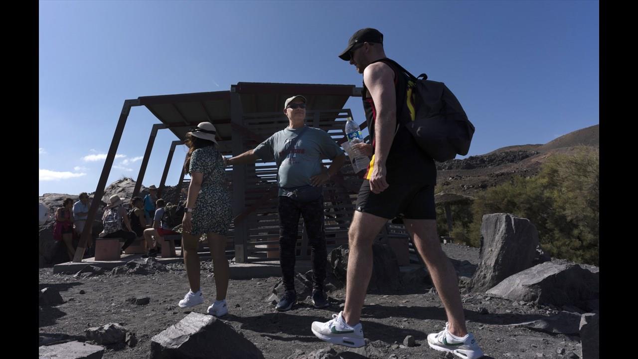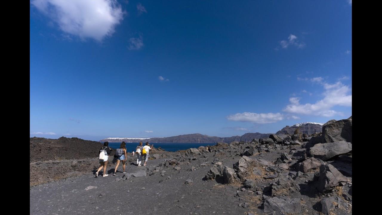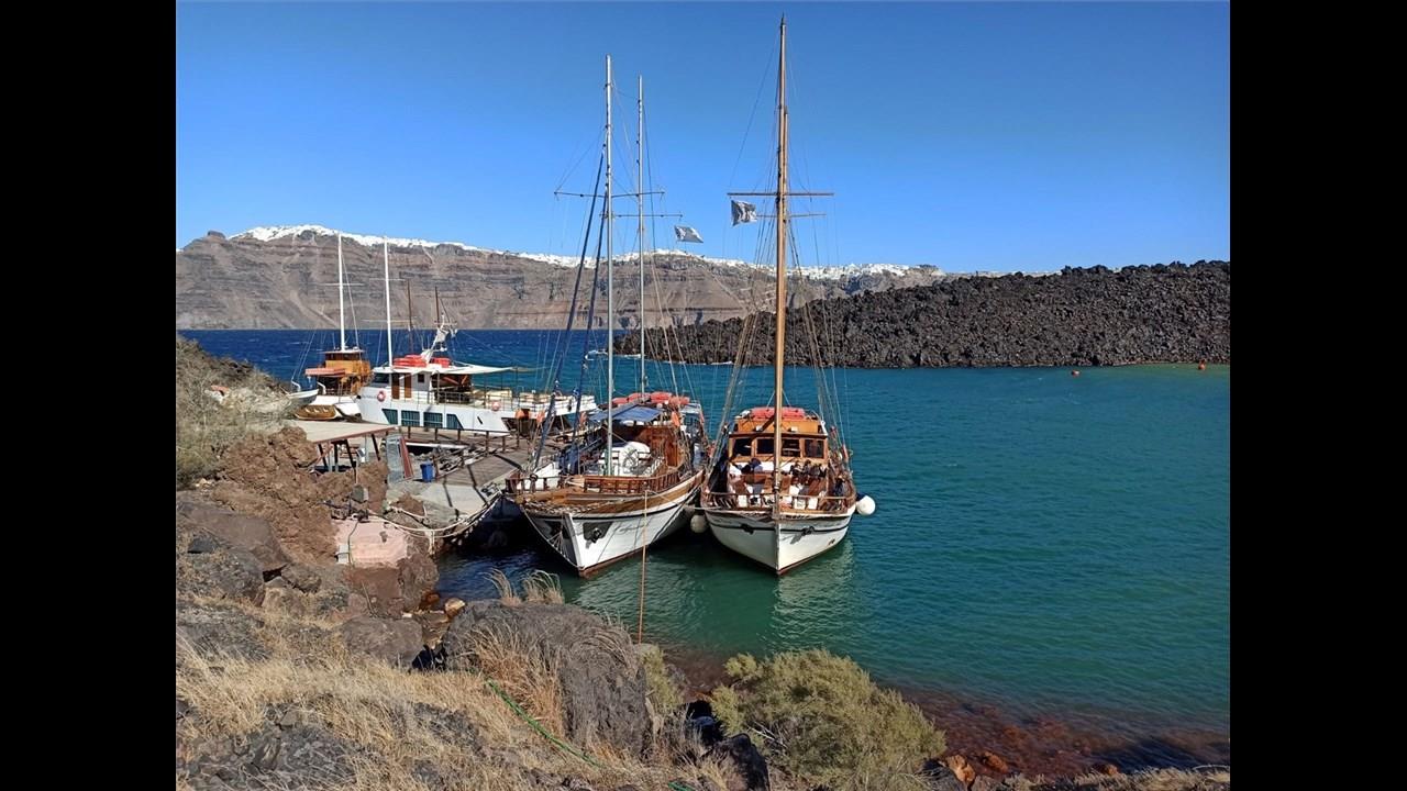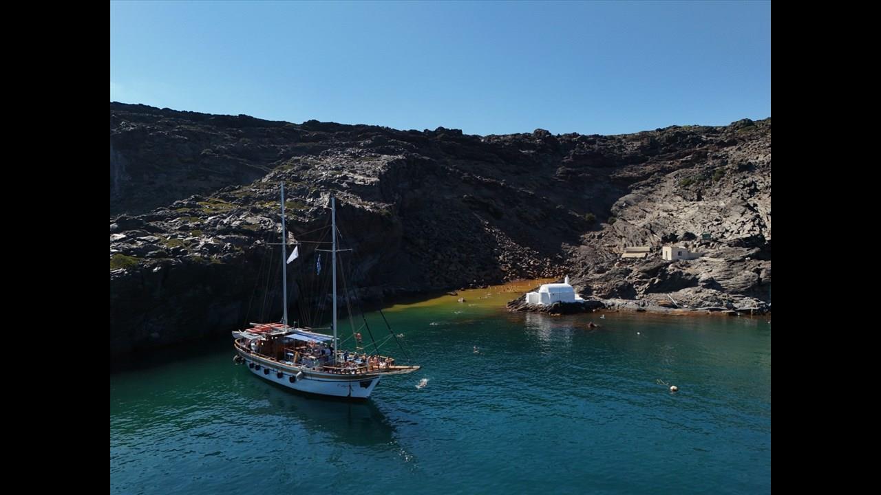 As the adventure begins, you will head for the first destination, the famous Volcano and its small bay of Erinia, which you will reach after a 10-minute sail. The boat will dock and stay there for 1 hour and 15 minutes, giving you the opportunity to hike a short path to the top with the presence of a guide, see the steaming craters, take stunning photos, and experience the distinctive sulfuric smell. As you explore the volcanic landscape, your guide will provide insightful details about the volcano's fascinating history and geology. A truly remarkable experience!