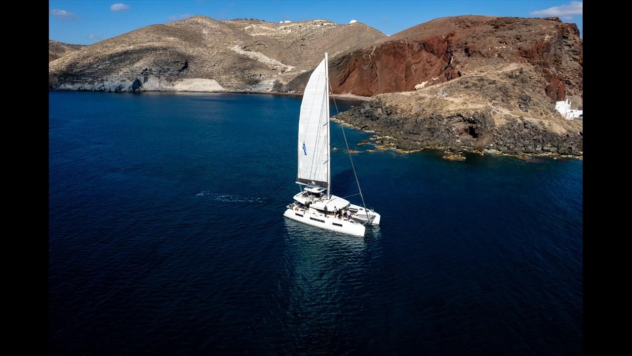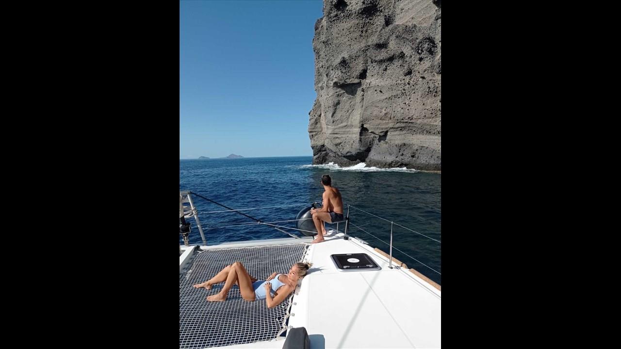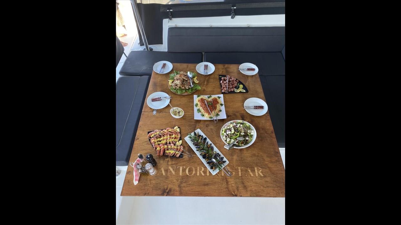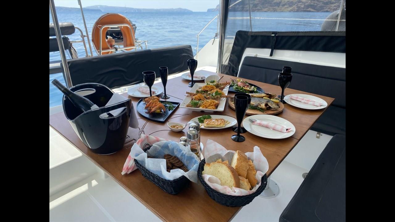 There are numerous things to do onboard - take delight in the catamaran ride and the amazing views of Santorini from the sea, sunbathe, and enjoy the meal the staff will prepare for you, or just relax with your drink on board!