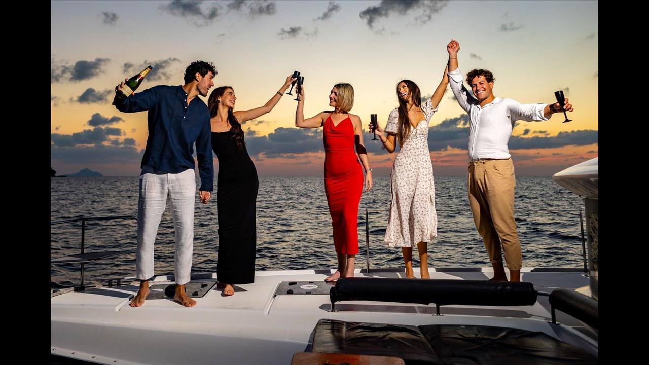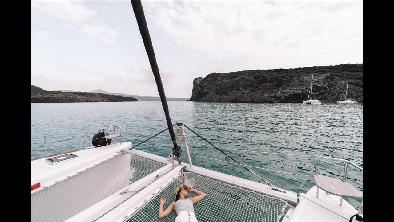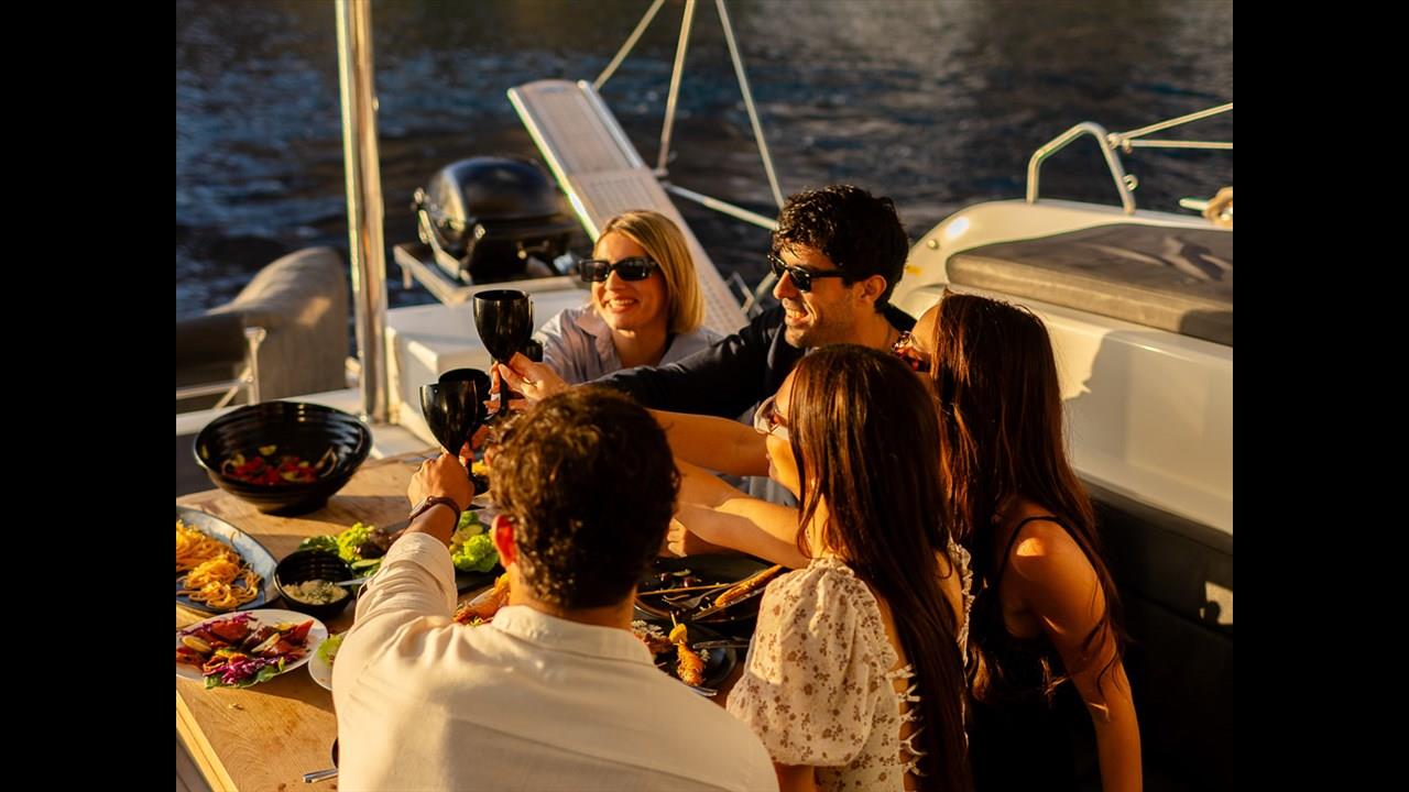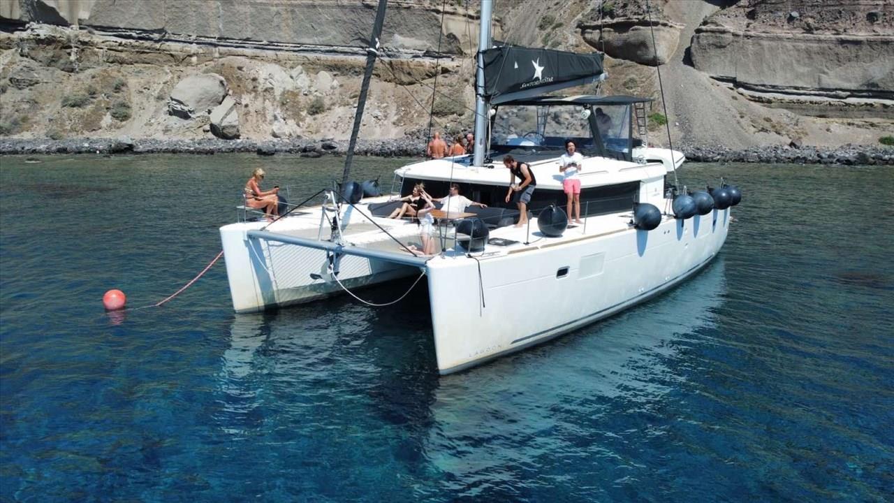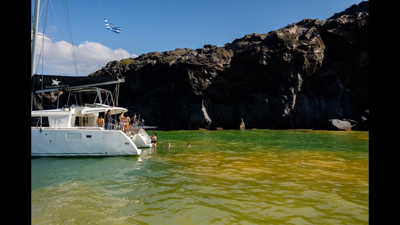 There are numerous things to do onboard - take delight in the catamaran ride and the amazing views of Santorini from the sea, sunbathe, and enjoy the meal the staff will prepare for you, or just relax with your drink on board!