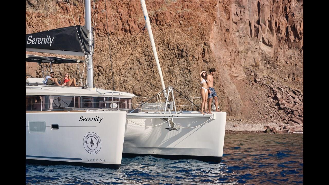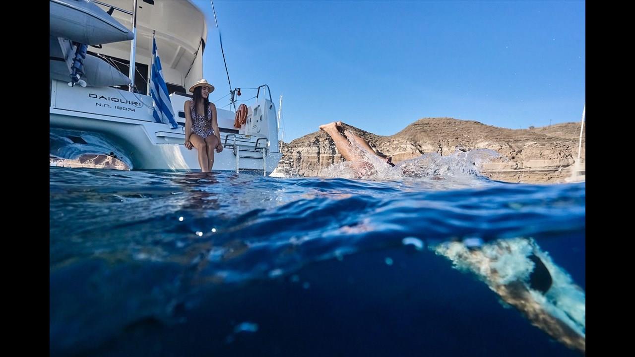 There are numerous things to do onboard - take delight in the catamaran ride and the amazing views of Santorini from the sea, sunbathe, and enjoy the meal the staff will prepare for you, or just relax with your drink on board!