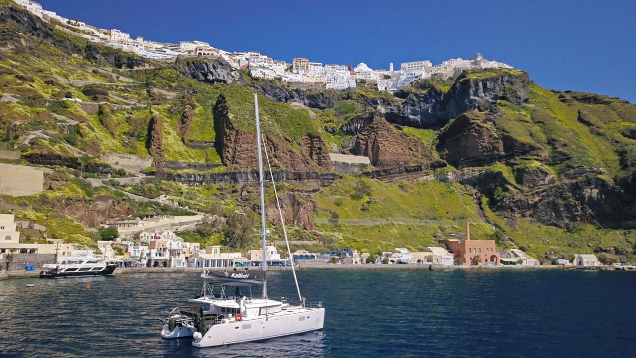 There are two different cruises to choose from, the 5-hour Day Cruise and the 5-hour Sunset Cruise, both embarking from the port of Vlychada on the south side of the island. Free transportation from/to your hotel is included.
