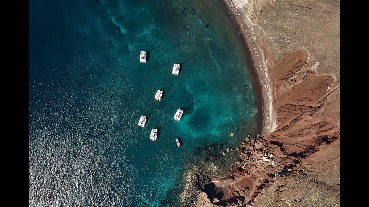 Both cruises follow the same itinerary, with the first amazing spot that you will witness being the beautiful Red Beach, with its high surrounding cliffs and the extraordinary color, that catches the eye of anyone who sees it. Next, you will continue cruising to reach the famous White Beach, where you can take the most stunning photos of the wild landscape around it. After, follows a stop at Mesa Pigadia Beach, where you will have some time to enjoy a refreshing swim in the clear waters or snorkel and explore the amazing underwater world. Snorkeling equipment is provided during the cruise. As the tour continues, you will pass by some interesting formations on the Caldera cliffs, called the Indian Rock formations, as well as see the beautiful Akrotiri Lighthouse, which is a wonderful site of unique beauty. After, get ready to visit the imposing Volcano of Santorini, feel its wild atmosphere, and take a dive in the deep blue Aegean Sea! Take in the most breathtaking view of this historical location, before heading back to Vlychada port for the end of the cruise.