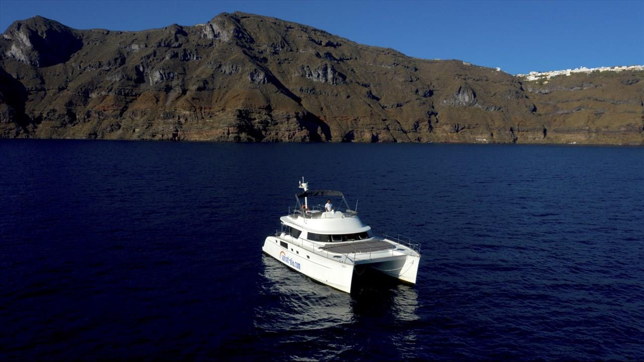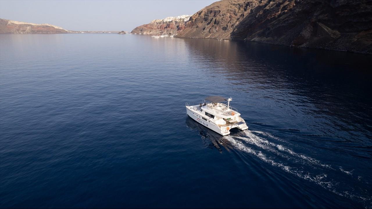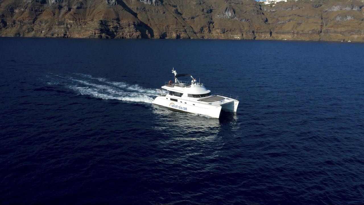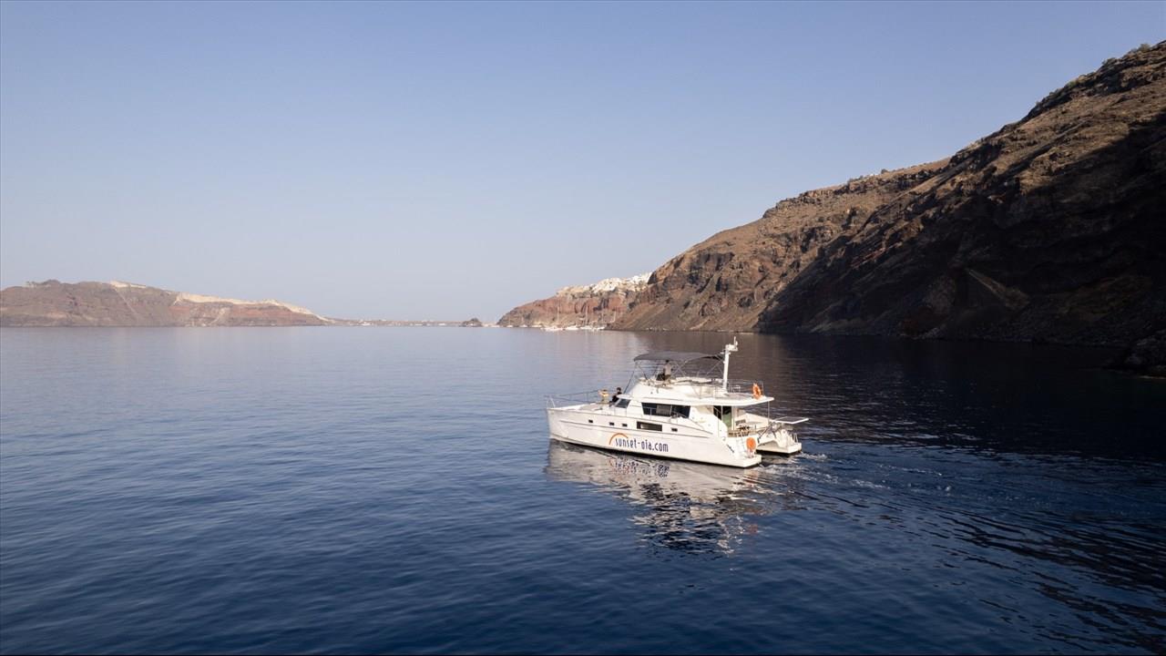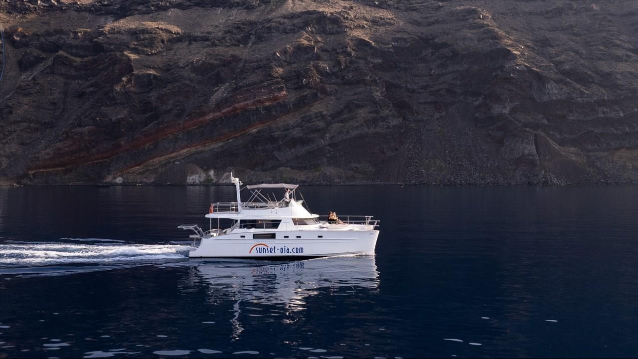 Power catamaran cruise, which has a passenger capacity of 14, owns luxurious indoor and outdoor areas, excellent performance and steady handling that make it ideal for a premium private, 5-hour tour around Santorini. Both of the tours available, morning tour and sunset tour, start from Ammoudi port and return to the same port so they are ideal for guests who stay in Oia and Imerovigli villages. Round transfers from and to all hotels in Santorini are included in the price.