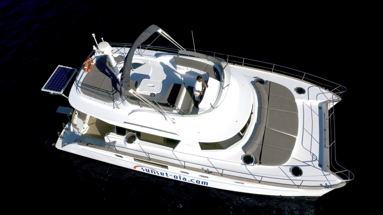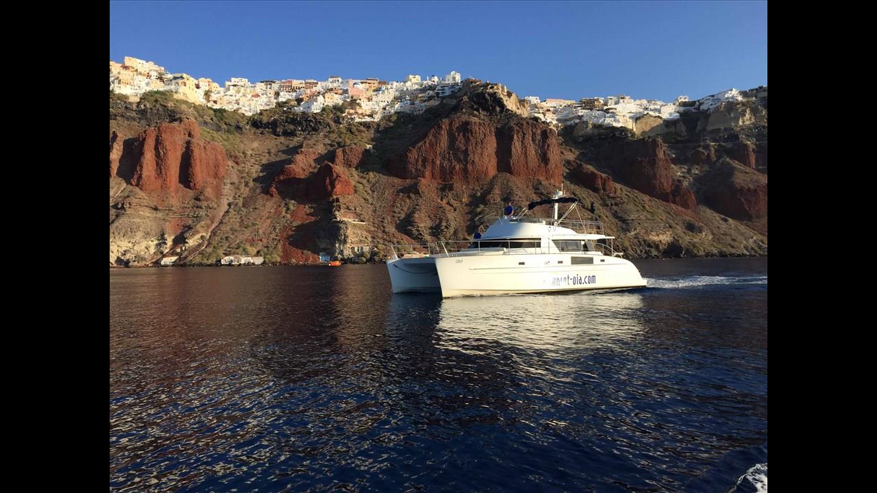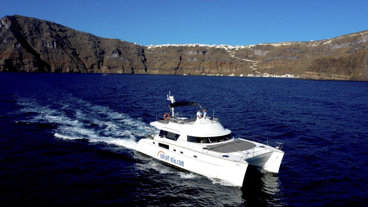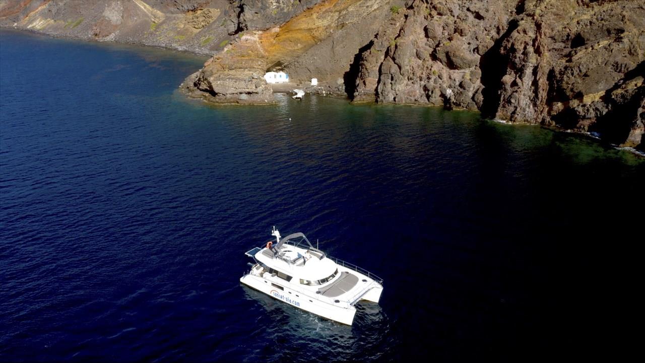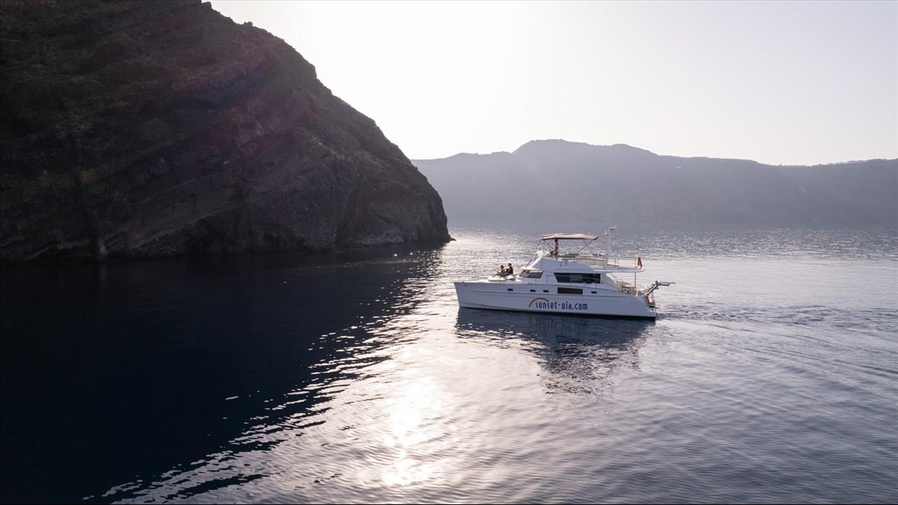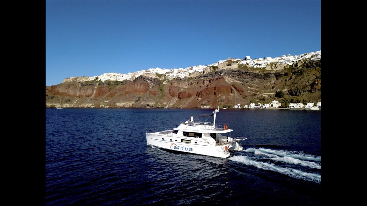 Power catamaran cruise, which has a passenger capacity of 14, owns luxurious indoor and outdoor areas, excellent performance and steady handling that make it ideal for a premium private, 5-hour tour around Santorini. Both of the tours available, morning tour and sunset tour, start from Ammoudi port and return to the same port so they are ideal for guests who stay in Oia and Imerovigli villages. Round transfers from and to all hotels in Santorini are included in the price.