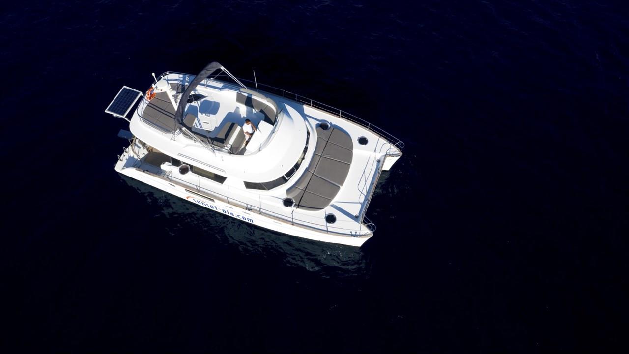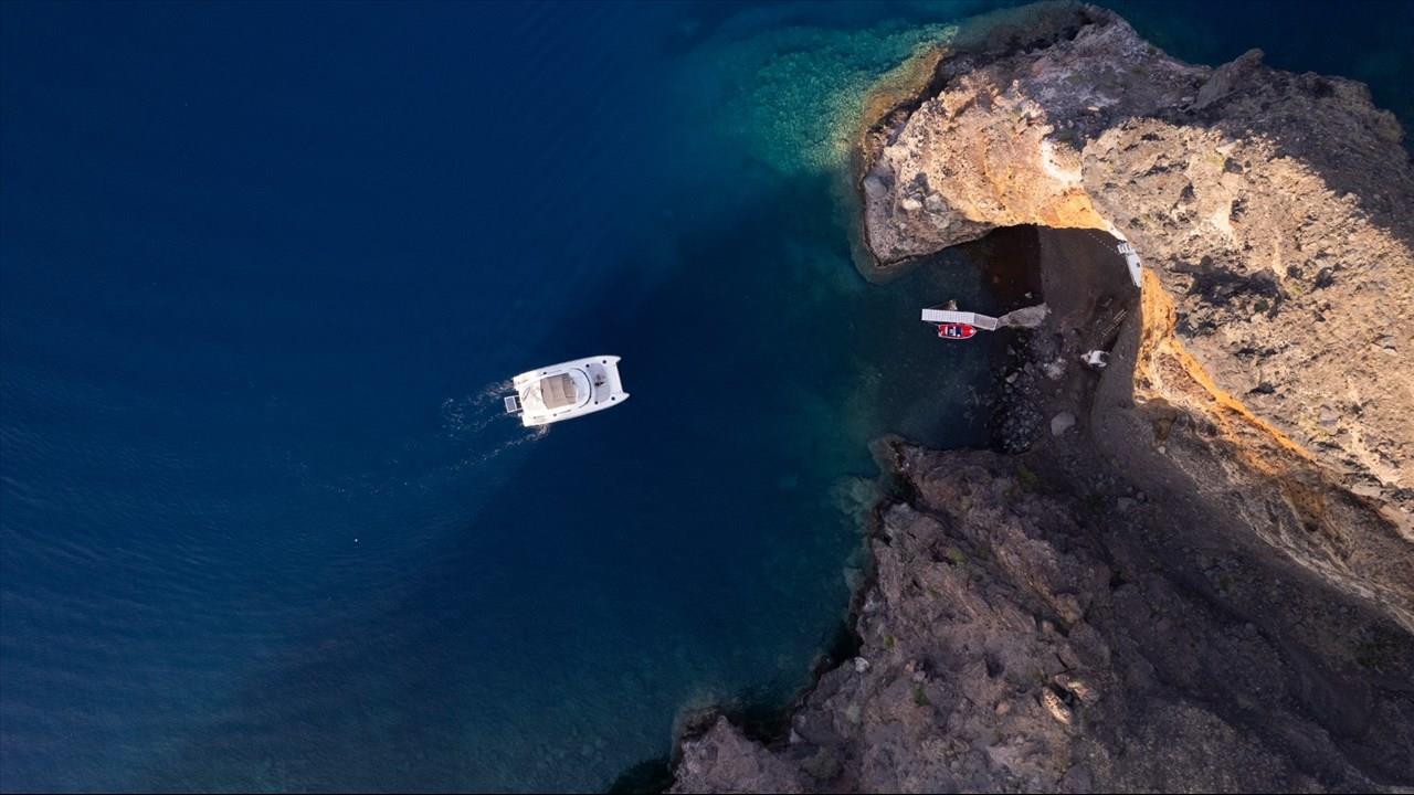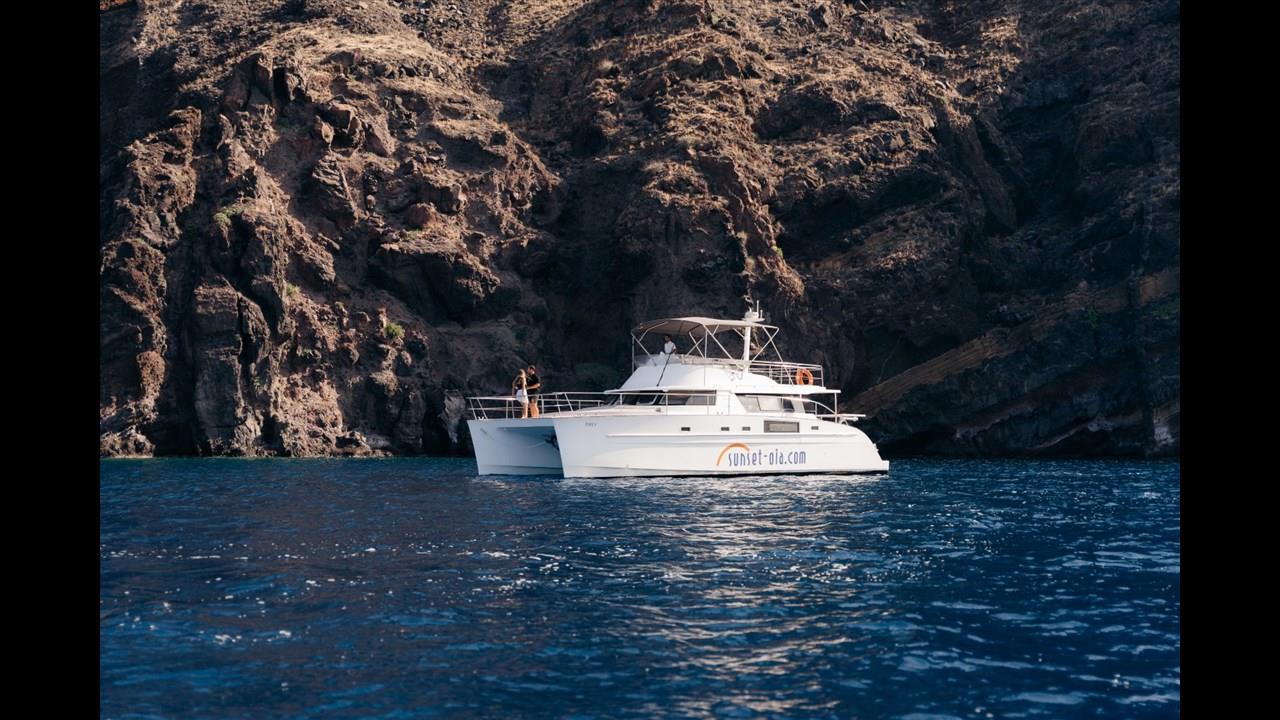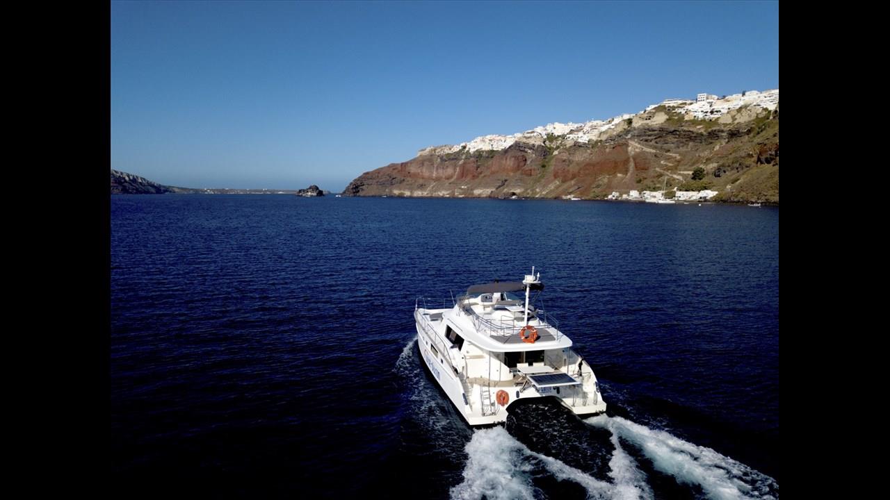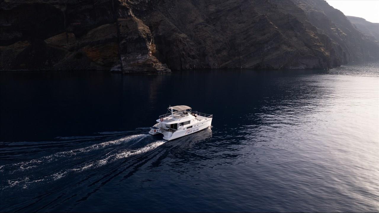 Power catamaran cruise, which has a passenger capacity of 14, owns luxurious indoor and outdoor areas, excellent performance and steady handling that make it ideal for a premium private, 5-hour tour around Santorini. Both of the tours available, morning tour and sunset tour, start from Ammoudi port and return to the same port so they are ideal for guests who stay in Oia and Imerovigli villages. Round transfers from and to all hotels in Santorini are included in the price.