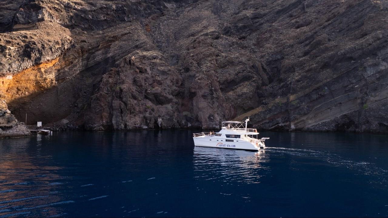 The morning tour starts at 10:30 while the sunset tour starts at 15:30. The catamaran sails below the awe-inspiring caldera and anchors at the volcano’s hot springs where you can take a mud bath in healing waters. Then as we set sail for the peaceful White Beach, we go past a small, uninhabited island called Aspronisi and the village of Akrotiri where you will admire the ancient lighthouse and Indian Rock, an impressive rock formation on the caldera cliffs that resembles a face.