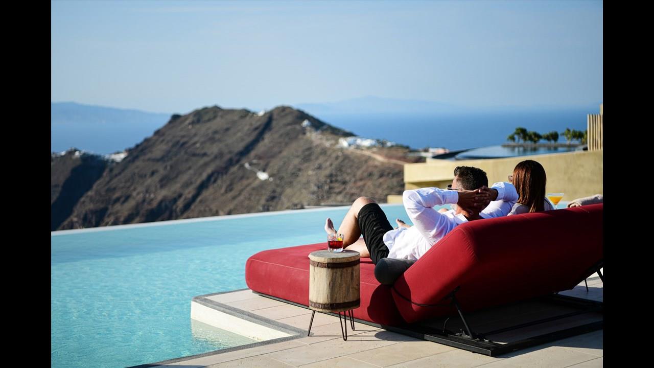 The pool is open daily from 10:00 AM until sunset, offering you ample time to relax. You’ll have the flexibility to choose your arrival time during checkout, with the latest entry recommended 4–5 hours before sunset to make the most of your visit and catch Santorini’s famous sunset from the comfort of your lounger. You can also choose between front-row daybeds, which offer panoramic views of the caldera, or second-row daybeds, slightly set back for a more private, shaded retreat. Alternatively, you’re welcome to choose a later time slot. Just keep in mind that the pool closes right after sunset, so staying beyond that time is not permitted.