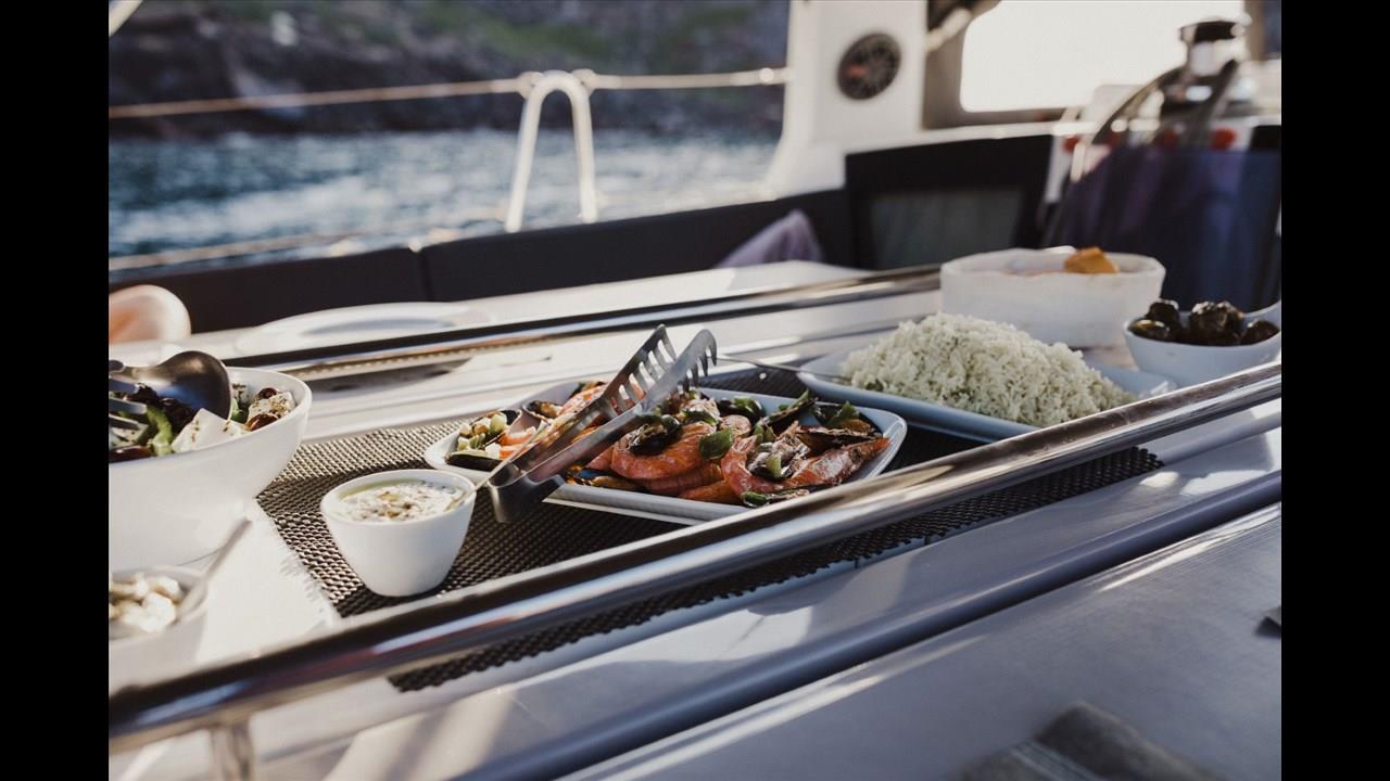 As you step onboard, you’ll be served a welcome drink. The deluxe yet homely vibes of the cruise will instantly make you feel at home. This tour includes transportation from and to the hotel along with high-quality snorkeling gear, fresh towels, and maps with important information about Santorini. All passengers are served a delicious meal on board. The menu includes fresh seafood, chicken fillet, salads, and dessert. A vegetarian meal can also be served upon request. The yacht features an open bar where you can enjoy sipping on some local white wine, beer, and other beverages.