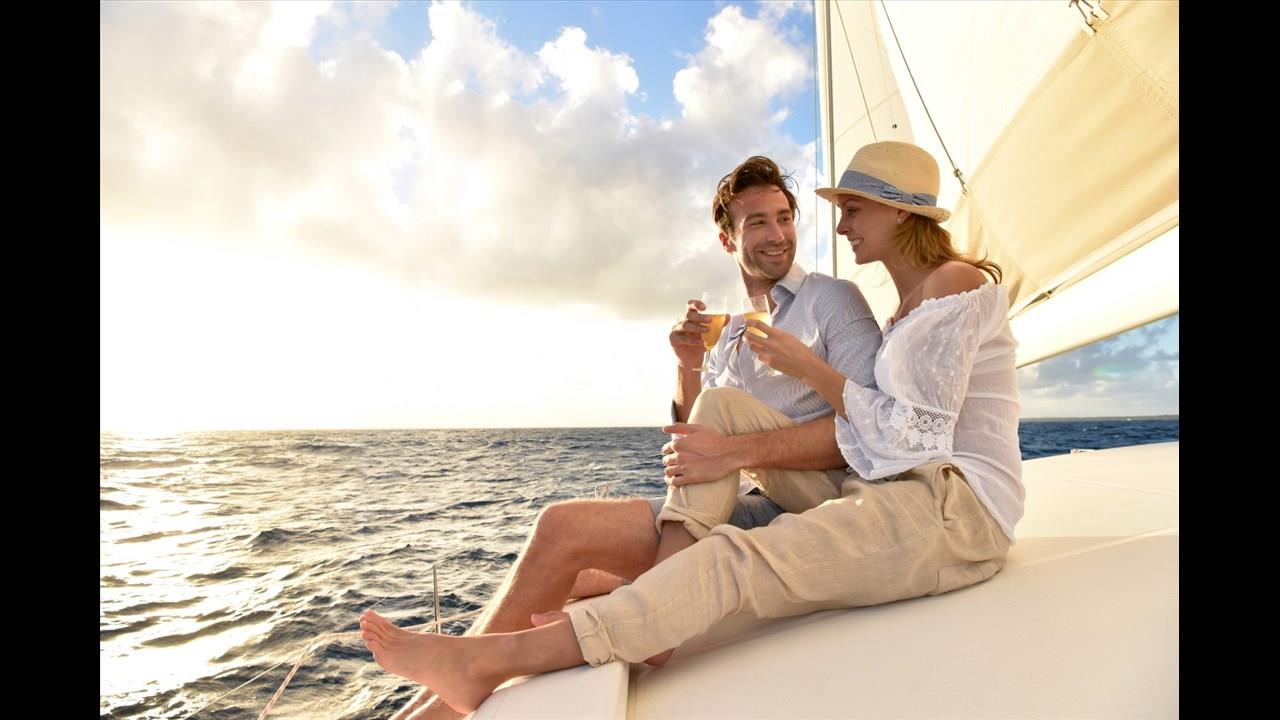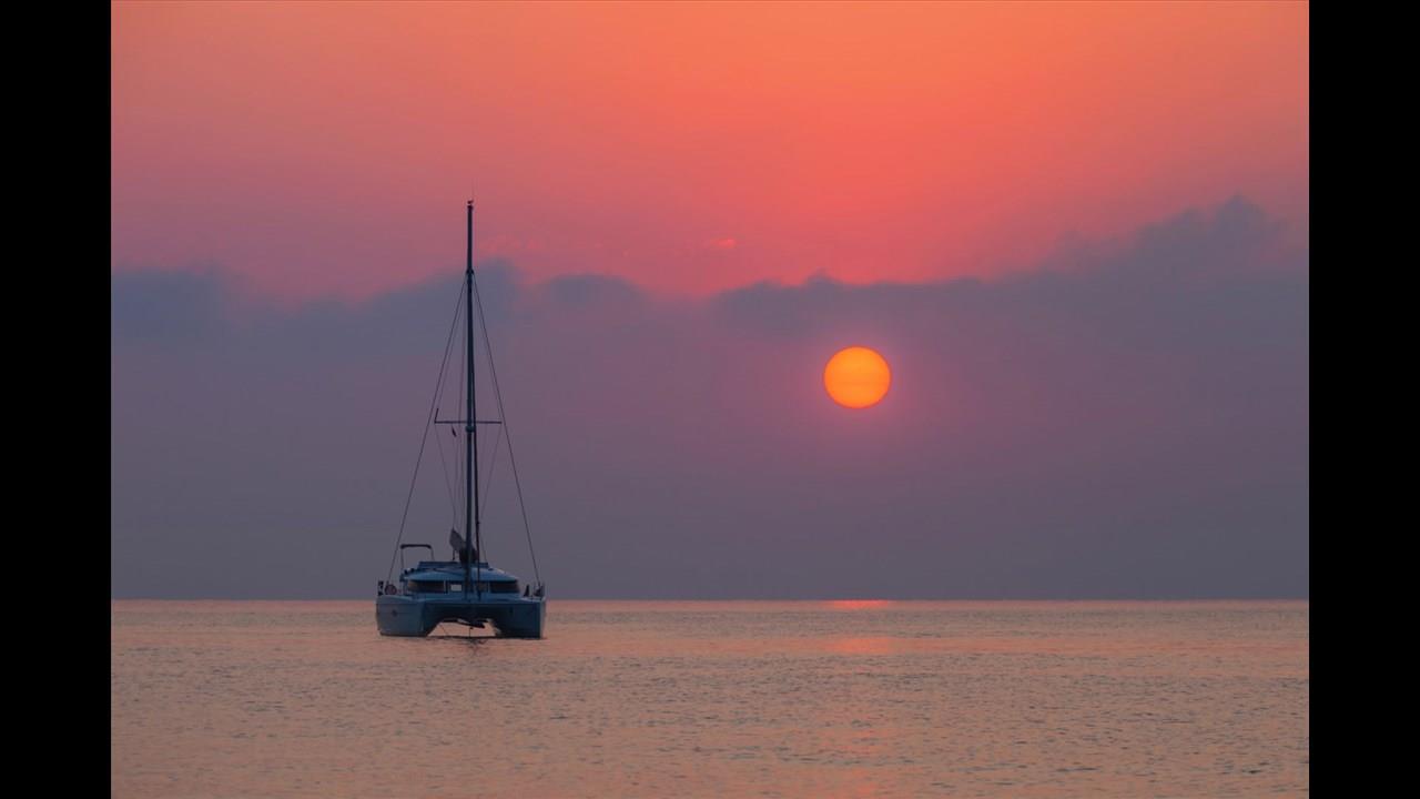 Imagine a perfect catamaran cruise as the day begins to fade, with the sun dipping low on the horizon. The boat glides smoothly across the calm, shimmering waters, its two hulls cutting through the waves effortlessly.