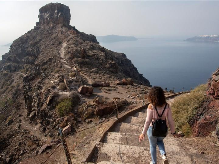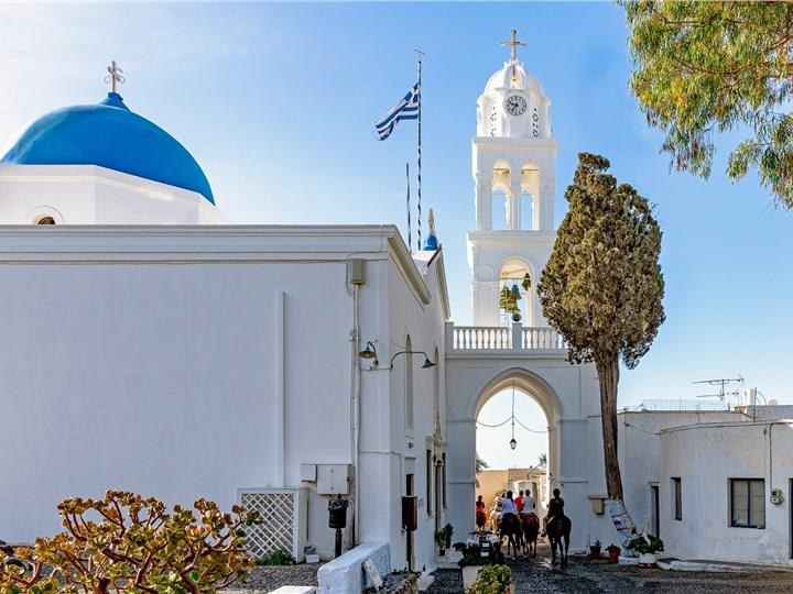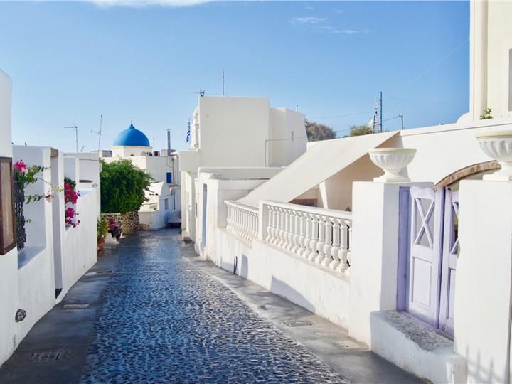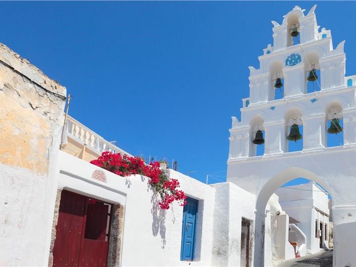Perched on the Caldera cliffs, Imerovigli is another beautiful village offering breathtaking views, while its charming, whitewashed buildings, narrow streets, and peaceful ambiance, create an ideal setting for privacy and romance, especially loved by honeymooners. Additionally, it boasts unforgettable sunsets, with views over the Aegean and the Santorini Volcano from its many five-star hotels and the private terraces of its beautiful restaurants, while there, you will also find an ancient fortress, Skaros Rock, offering a nice hike and stunning views. Whether you choose hiking along its paths or enjoying the unparalleled scenery from the privacy of a balcony, a visit to this enchanting village ensures beautiful holiday moments.