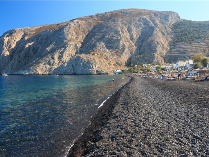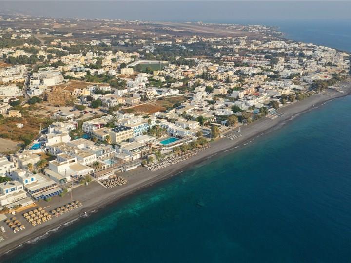 The vivid Kamari is a seaside village on the southeastern coast of Santorini and is ideal for those who wish to spend their holidays by the beach. Its famous wide black sand beach is well-organized, featuring deck chairs, umbrellas, and lifeguards, offering a relaxing and safe environment. There is also a lively promenade by the shore ideal for nice strolls, lined with shops, restaurants, taverns, and cafes, which create a traditional atmosphere. Modern amenities and easy accessibility attract tourists and make it an ideal location for families and visitors who wish to experience the charm of Santorini, away from the crowds.