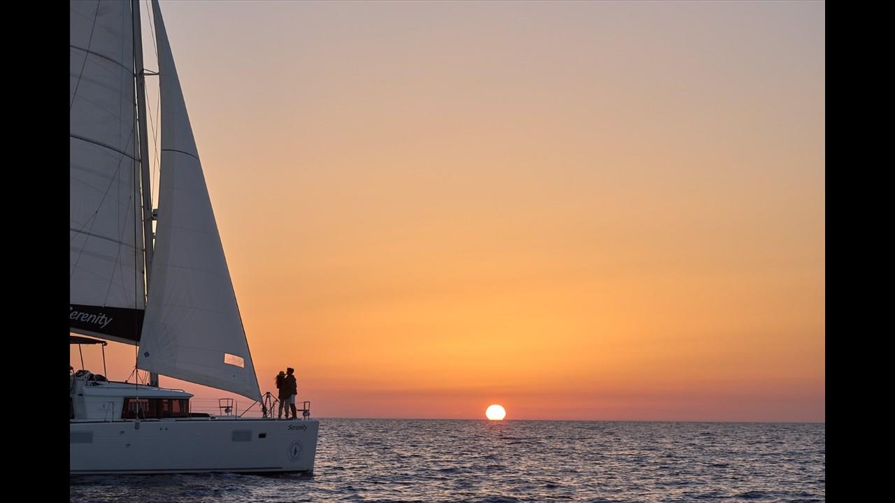 The next stops are at Mesa Pigadia Beach, White Beach or Red Beach, depending on the weather conditions and the wind. Here, besides the tremendous landscapes, you can relax by the water or swim your worries away in addition to taking beautiful photos and use the snorkeling gear to discover underwater thrills. Most of all, you will indulge in a palatable meal in spectacular surroundings. After dinner, following the caldera coastline, you can take splendid photographs of the admirable old port of Fira, the hidden church of Seven Holy Youths and the bay of Armeni. Before the end of the cruise, get ready for the highlight of the tour – the captivating sunset of Santorini at the best spot, under the village of Oia– a mesmerizing spectacle to relish on board.