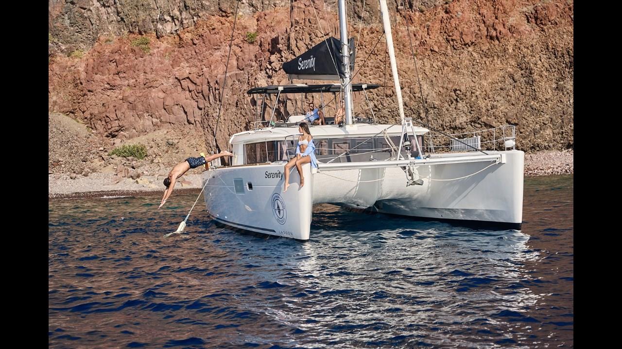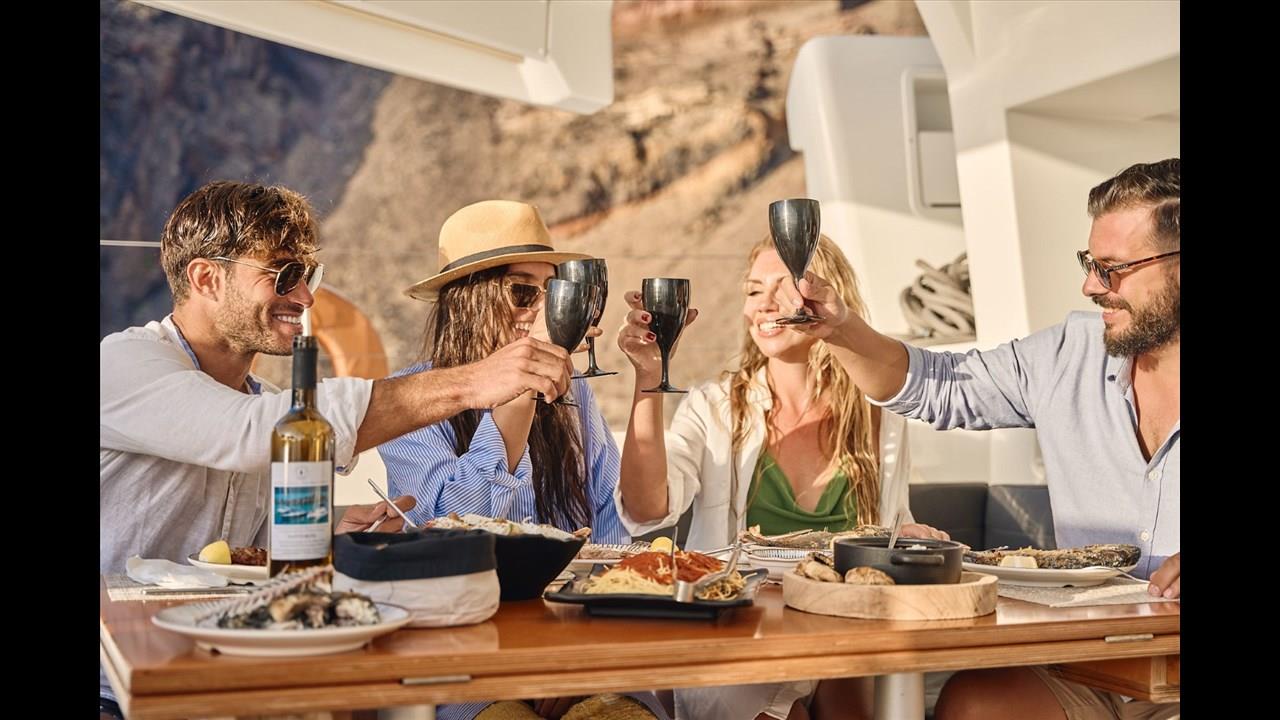 There are numerous things to do onboard - take delight in the catamaran ride and the amazing views of Santorini from the sea, sunbathe, and enjoy the meal the staff will prepare for you, or just relax with your drink on board!